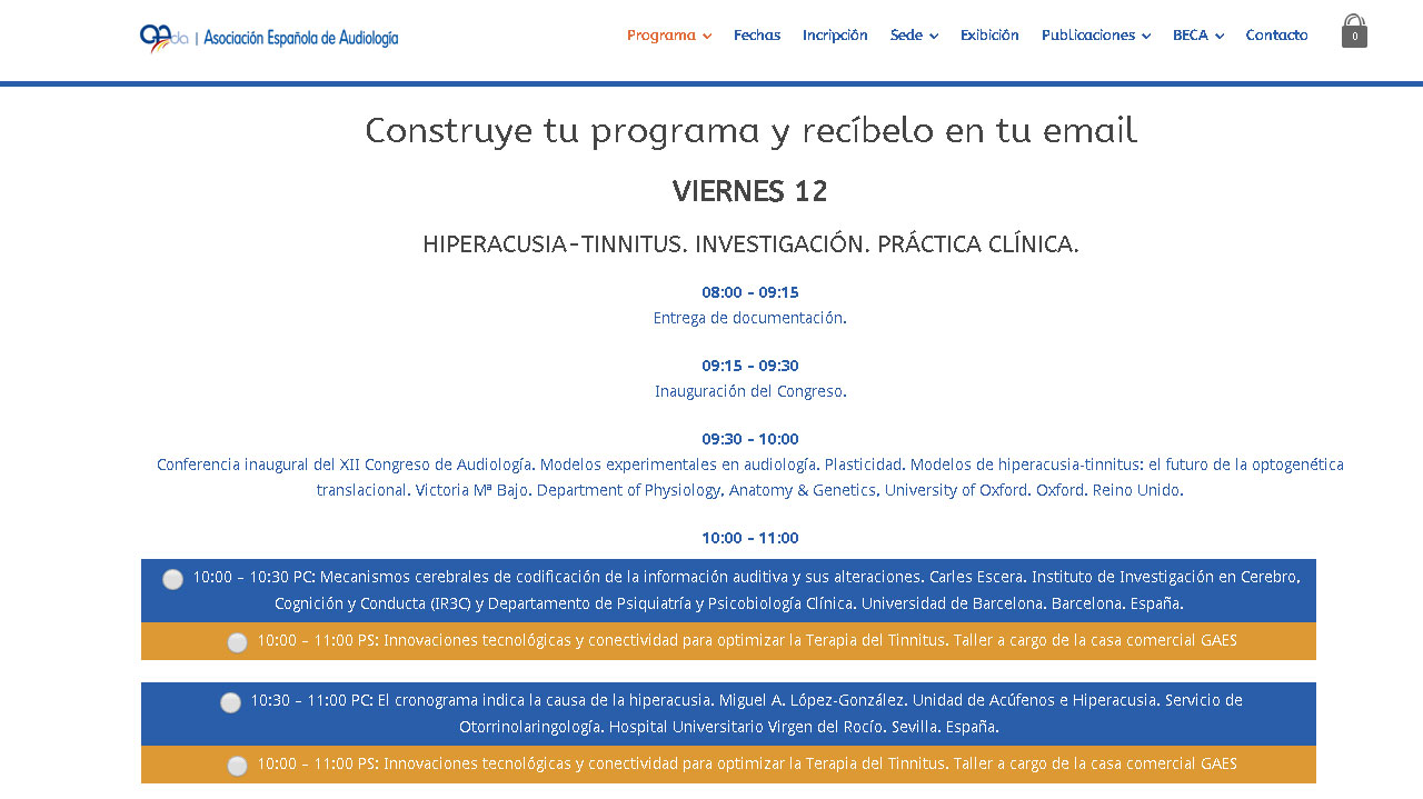 La web autogestionable del XII Congreso Nacional Audiología AEDA pretende ser el punto de información y suscripción de los interesados en participar en este evento de nivel nacional. Para ello se ha montado una plataforma que incluye tanto el formulario de suscripción como el pago online de la misma, así como el apartado “Construye tu programa” donde el usuario elige el horario más conveniente y lo recibe cómodamente en su email.